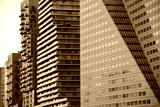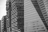 Modern urban architecture featuring a mix of residential high-rise buildings and sleek glass skyscrapers, showcasing contemporary design and city life dynamics