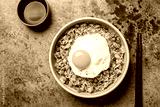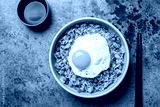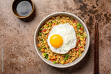 Fried egg on rice with vegetables, green peas, bell pepper, carrot and zucchini, served with soy sauce, chopstick. Top view, brown table surface.