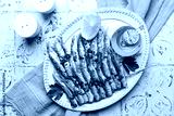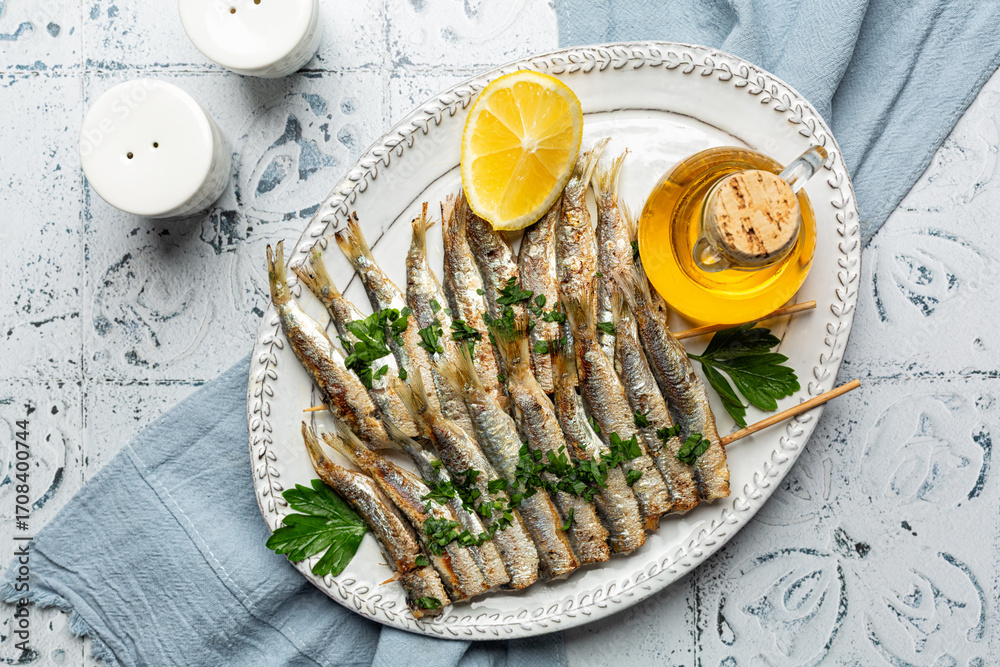 Top view of Grilled Sardines skewers on a white plate with lemon and olive oil. Mediterranean food.