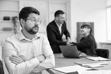 Man feeling jealous of his successful colleague receiving congratulations in office, selective focus