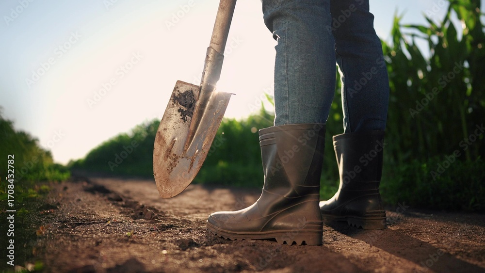 corn farming. a farmer walks next to a field of corn holding a shovel close-up of his feet in rubber boots. agriculture business corn concept. farmer feet in maize rubber boots with a shovel