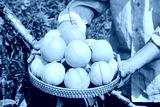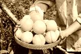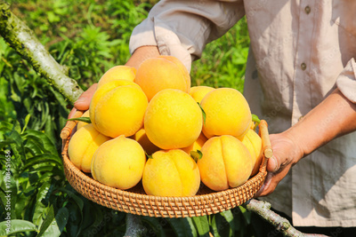 Fresh Yellow Peaches in Wicker Basket Held by Hands in Garden Setting