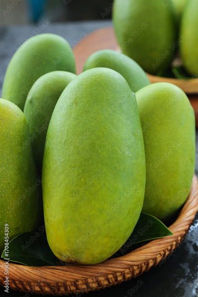 Fresh Green Mangoes in Wicker Basket at Traditional Market Display