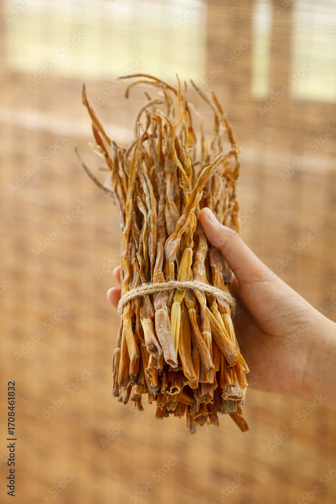 Farmer holding bundle of sundried bamboo shoots with rope tie - traditional Asian cooking ingredient