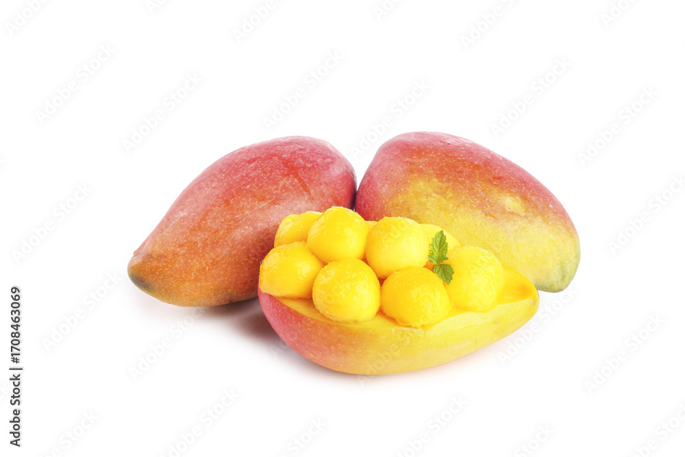 Fresh Mango Fruit with Toffee Candy Spheres on White Background - Creative Food Photography Concept