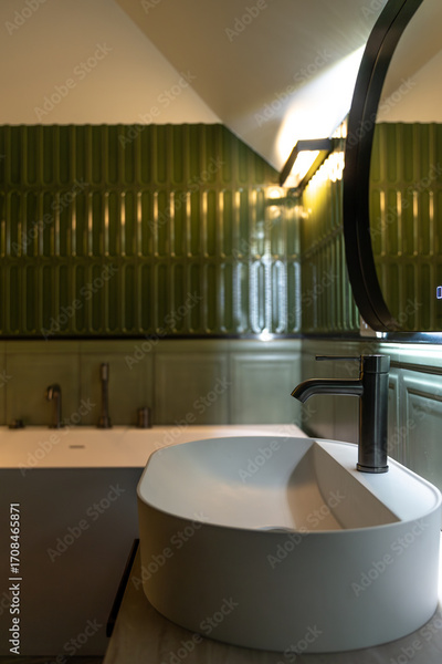 Basin and black faucet in green bathroom with lighting. Cozy spa nook.