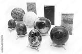 Natural minerals, amber on a white background. Beautiful crystals of spherical and ovoid shape of different colors for jewelers and collectors. Amethyst, opal, chrysolite, amber and other minerals.