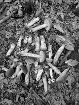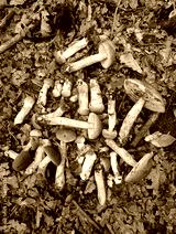 Edible picked aspen mushrooms in the forest, view from above. Beautiful natural background with brightly colored mushrooms and dry oak leaves. Mushroom picking.