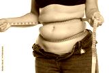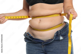 Studio shot of overweight woman with belly fat measuring waist using tape while jeans remain unbuttoned on white background.
