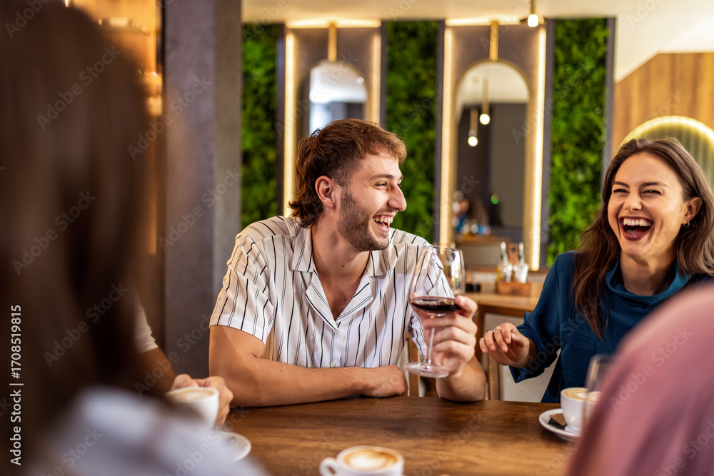 Group of young friends enjoying their time together in modern cafe, chatting and relaxing in casual social setting.