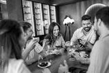 Group of young friends smiling and enjoying glasses of wine together in modern restaurant, cheerful social moment.