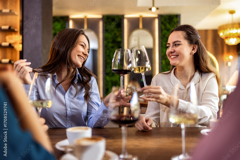 Two young women smiling and clinking glasses of wine in modern cafe, cheerful and celebratory moment.