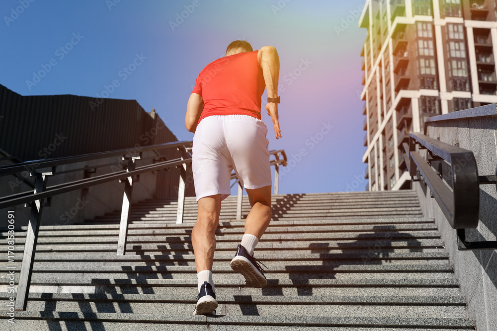Man in sportswear running up on stairs outdoors, low angle view