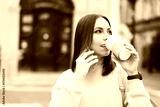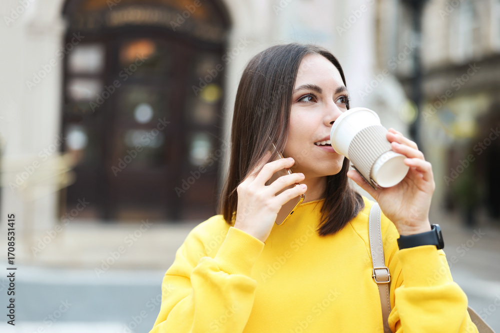 Coffee to go. Woman with paper cup of drink talking on smartphone outdoors, space for text