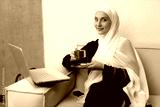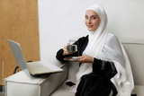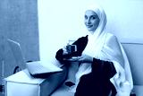 A beautiful young Muslim woman drinks tea while working on a laptop