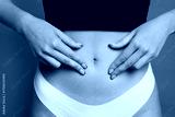 Young woman with flat belly on grey background, closeup