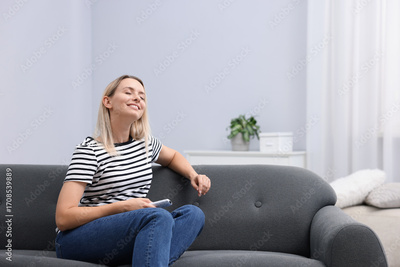 Woman with air conditioner remote control on sofa at home. Space for text
