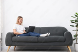 Woman with laptop on sofa at home. Space for text