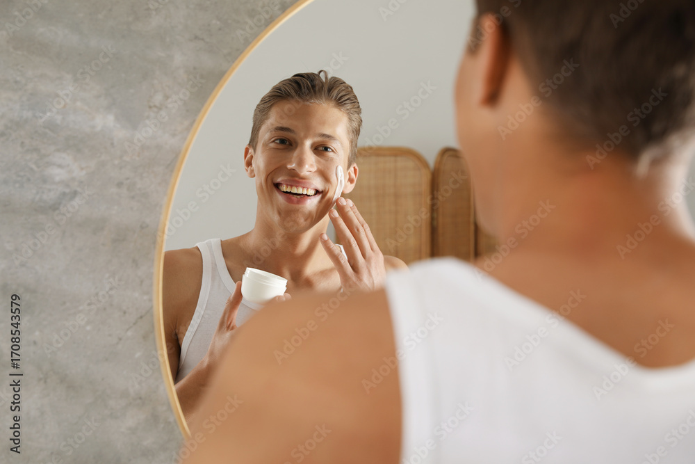 Handsome young man applying cream onto his face near mirror in bathroom