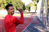 Smiling man in sportswear doing warm-up exercise before run at stadium. Space for text