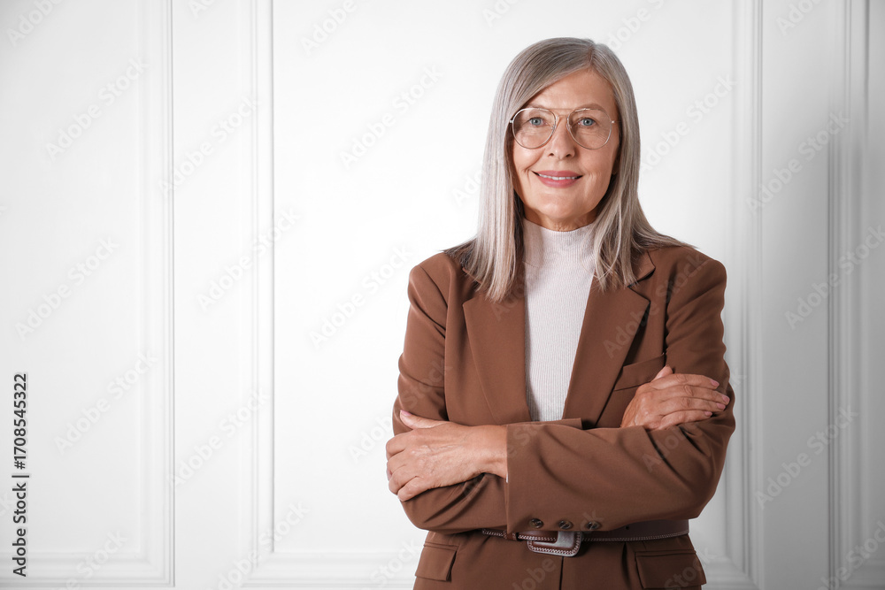 Portrait of beautiful senior woman near white wall. Space for text