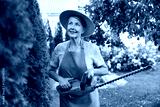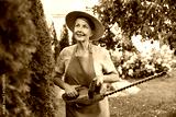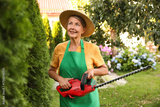 Smiling senior woman in hat and apron with electrical hedge trimmer in garden