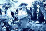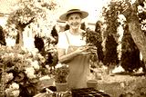 Smiling senior woman in hat and apron with beautiful potted roses in garden