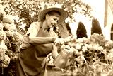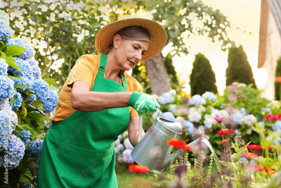 Senior woman in hat and apron watering beautiful flowers with can in garden
