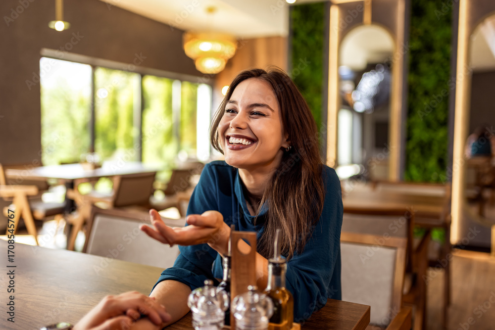 Young woman smiling at someone across the table in modern cafe, cheerful and candid moment focused on her.