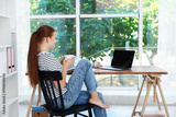 Teenage girl with cup of drink at wooden desk indoors. Home workplace