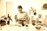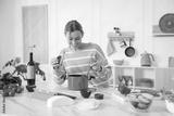 Smiling woman cooking at table in kitchen