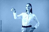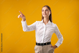 Beautiful woman pointing at something on yellow background
