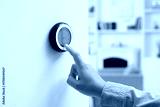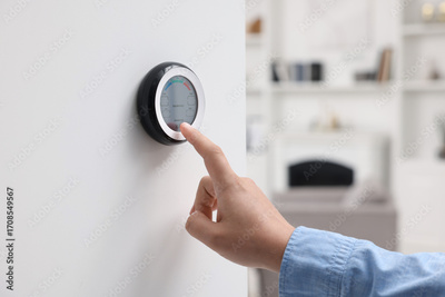 Woman adjusting hygrometer on white wall indoors, closeup. Smart home system
