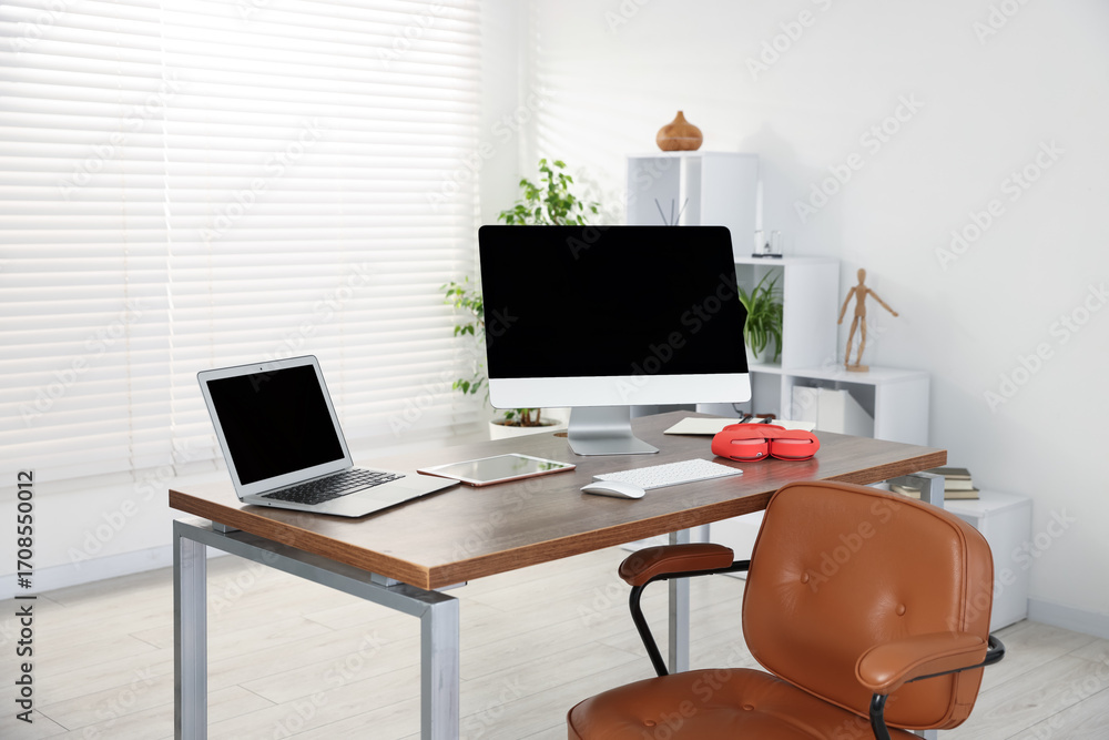 Modern workplace with computer, laptop, tablet and headphones on wooden desk in office