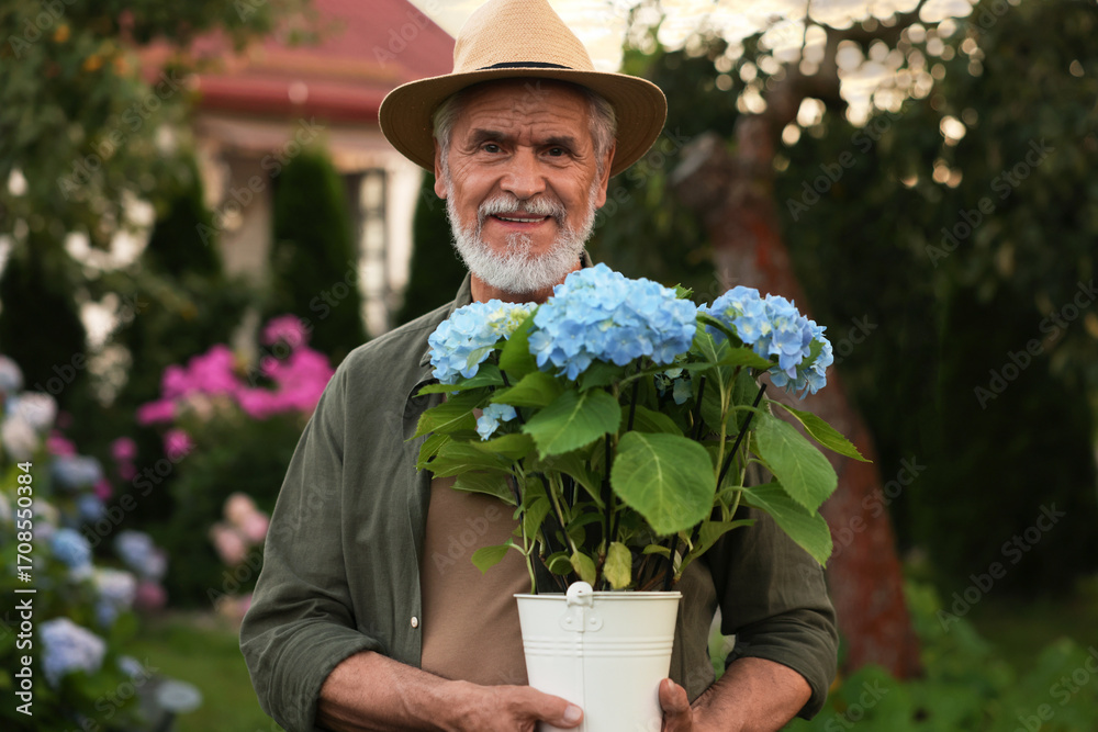 Portrait of smiling elderly man in hat with potted flowers in garden