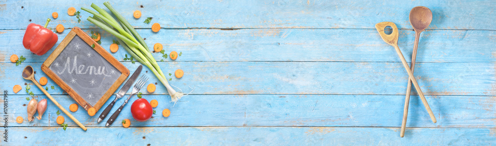 food ingredients and chalkboard for menu or recipes, food template, flat lay