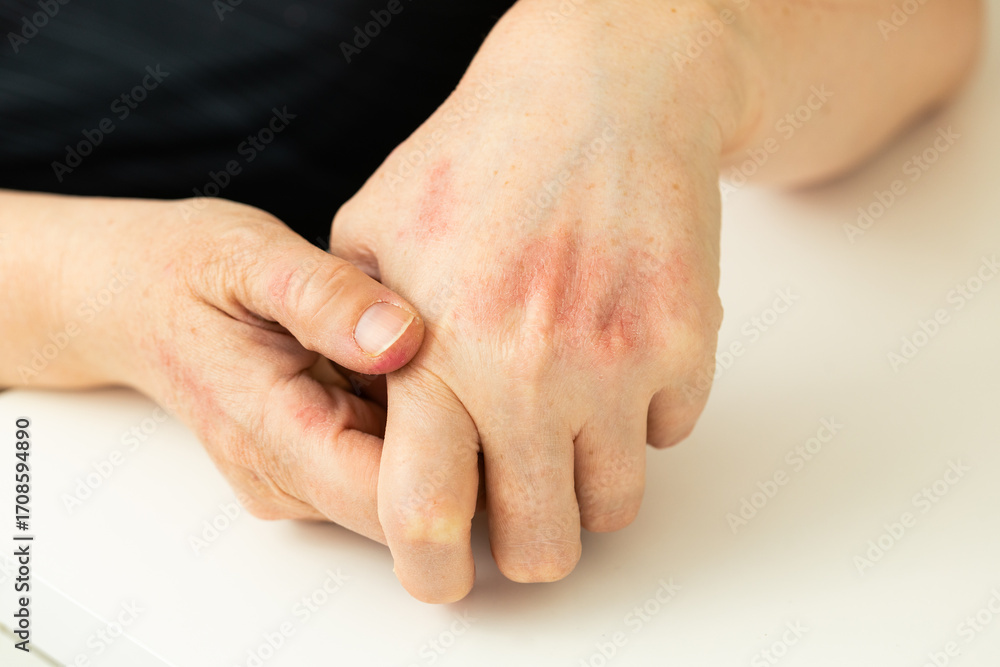 Atopic dermatitis, Allergy, severe allergy. Skin discoloration, Itching of the hands. Medical concept. Healp and treatment. close up