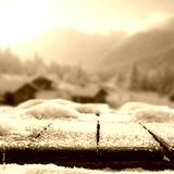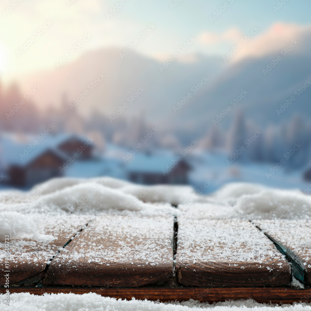 Snowy mountain landscape in the heart of winter, with tree-covered slopes and frosty pine forests under a bright winter sky. Empty wooden surface snow-covered space perfect for product placement.