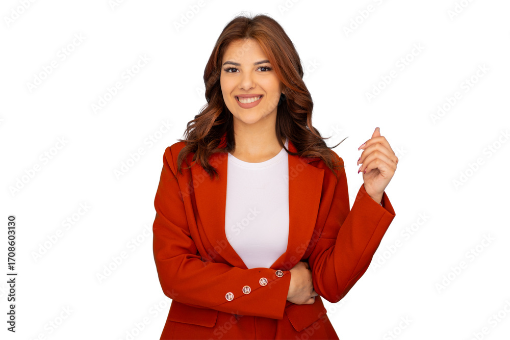 Confident businesswoman in a striking red suit, smiling and gesturing with her hand, exudes professionalism on a transparent background