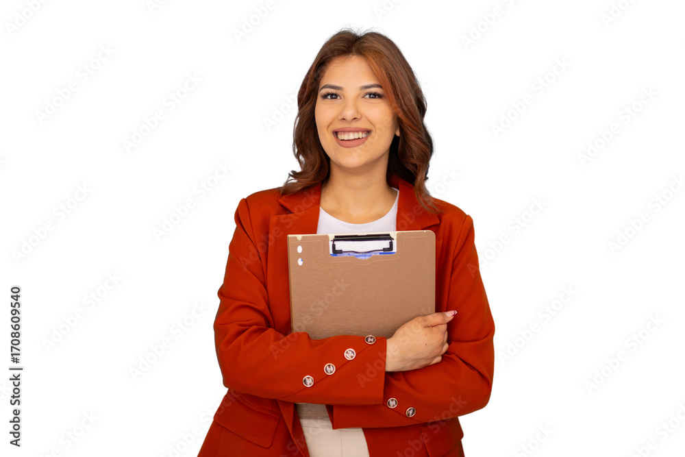 Professional businesswoman smiling, holding clipboard in studio setting, transparent background ideal for graphic design and corporate branding