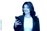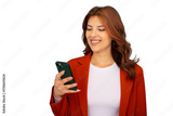 Professional businesswoman radiating confidence, checking smartphone with warm smile, standing against clean white background