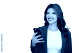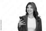 Happy businesswoman holding a smartphone and looking away, exuding confidence and style against a transparent background