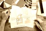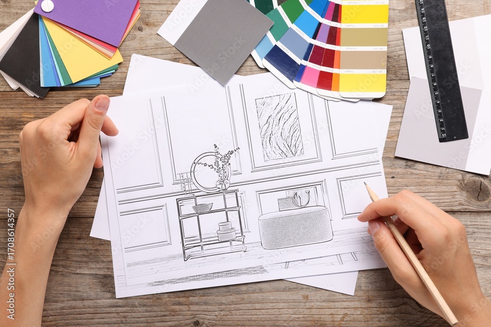 Woman drawing sketch of room interior at wooden table, top view
