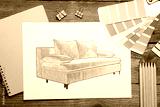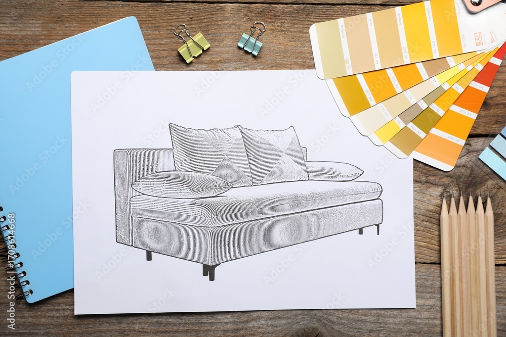 Sketch of sofa and stationery on wooden table, flat lay