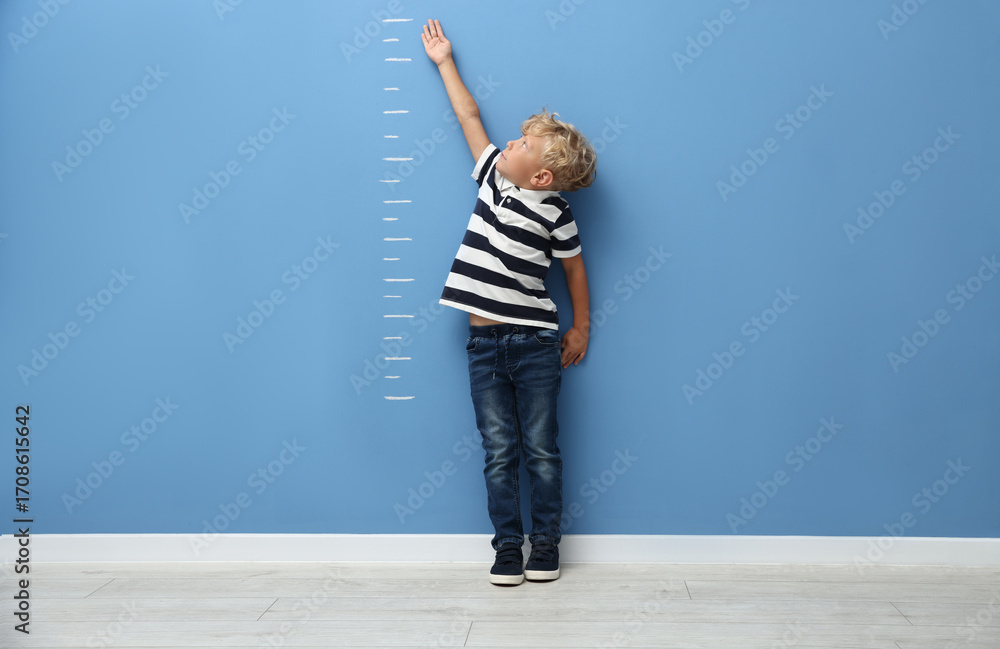 Cute little boy measuring his height near blue wall