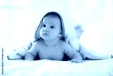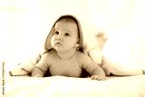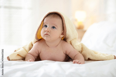 Cute baby covering with yellow towel after bathing on bed, closeup