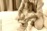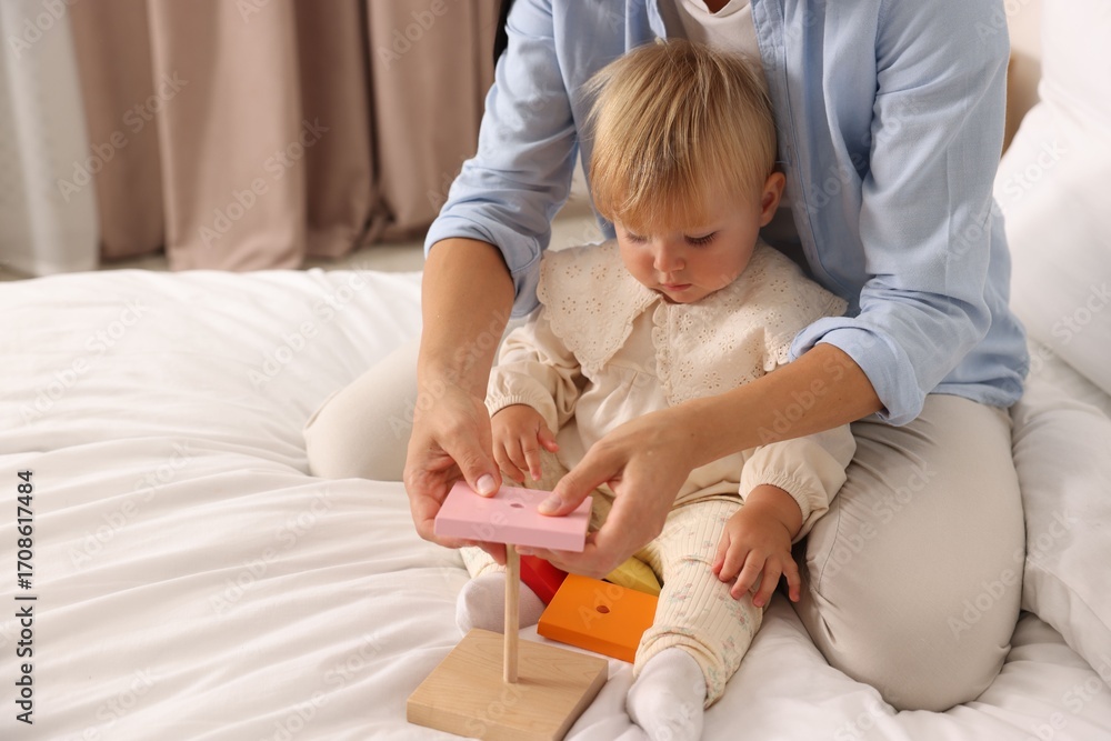 Cute baby girl and her mother playing with toy on bed at home, closeup. Space for text