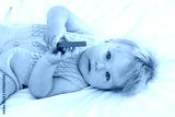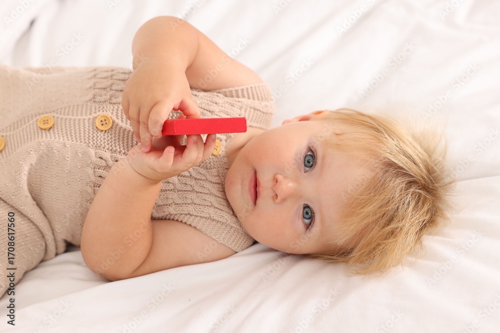Portrait of cute baby with toy lying on white blanket, closeup