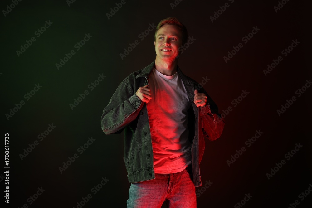 Smiling man wearing jacket in neon lights against black background
