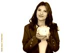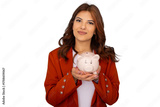 Businesswoman smiling and holding piggy bank, promoting saving and financial responsibility, on a transparent background